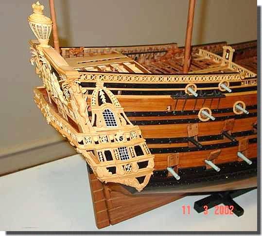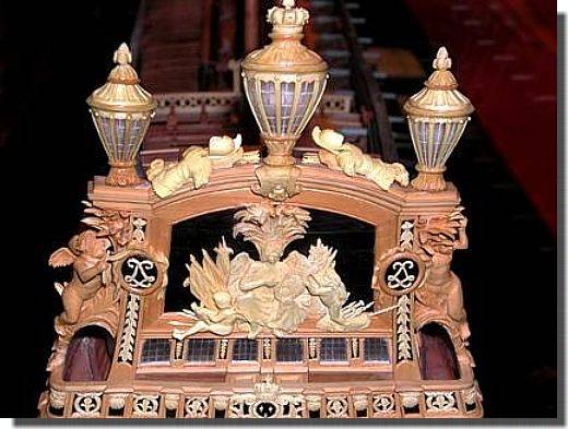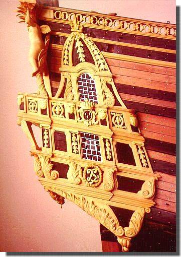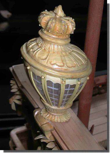 Au dessus, placés sur le cintre du couronnement, les trois fanaux de poupe et