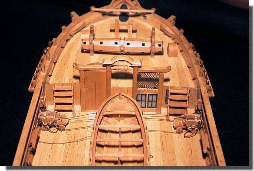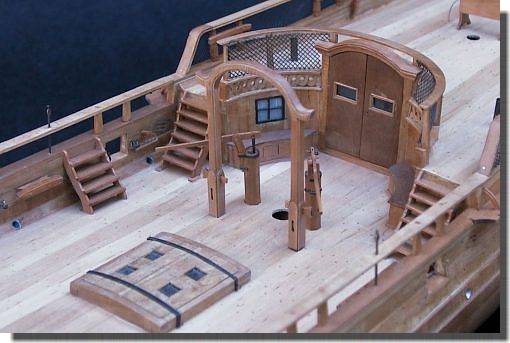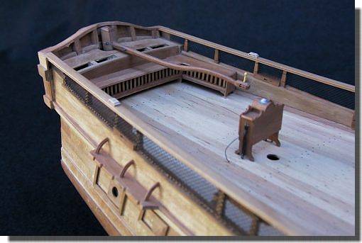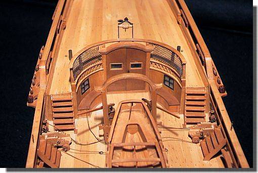 arrière du gaillard contre le tableau, est garnie par les cages à poules. La barre du gouvernail, de forme élégant, est équipée d'une poignée. Placée entre cette dernière et le mât d'artimon on trouve l'habitacle des compas. |