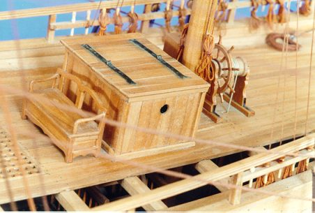 ici... En avant, le banc de quart qui représente un intéressant travail de modélisme. La roue de la barre est placée en arrière du mât d'artimon, sur le coté on devine un des deux habitacles des compas. A l'arrière plan, on peut voir une lisse portant les cabillots pour certaines manœuvres du grand-mât et du mât d'artimon. |