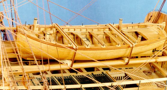 Le pont étant destiné au séjour des captifs pendant la journée, il doit être libre d'apparaux aussi la chaloupe est placée sur la mâture de rechange. Cette chaloupe est classique, elle porte quatre chandeliers destinés à porter des pierriers. Elle est immobilisée sur la mâture par l'intermédiaire de berceau travaillés à la forme des espars. Deux gouttières en bois guident les risses qui sont ridées par des caps de moutons (invisibles ici). Au dessous, les grilles de fer qui remplacent les habituels caillebotis, le tambour à claire voie pour le passage de la grande écoutille et en avant, le panneau des câbles verrouillé par des barres d'écoutilles fermant à cadenas. |