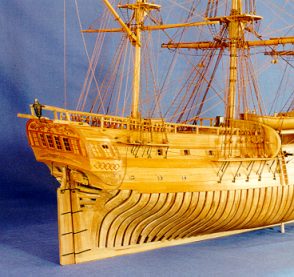 Vue de trois quart arrière de la corvette. On devine la palissade séparant les captifs du gaillard d'arrière. Elle déborde largement sur les cotés du bâtiment. On pourra noter que les couples ne comportent pas de demi-varangue.