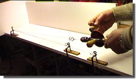 tout en maintenant la tension. 9) Recommencer les operations 5) à 8) autant de fois qu' il y a de torons dans la aussière. Sur la photo, le toron N°1 a déjà été torsadé, le N° 2 est en cours, le N° 3 en attente :