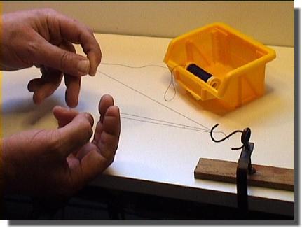 5) Étendre, sans tension excessive, le nombre de fils nécessaires à la confection d'un toron, entre les crochets A et B. pour s’épargner autant d’allers-retours que de fils dans les torons, on peut tendre trois fils en même temps. Pour garder les mains libres, on met la bobine dans un récipient quelconque.